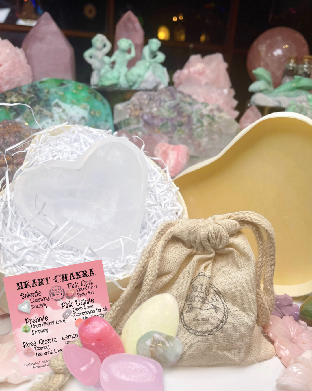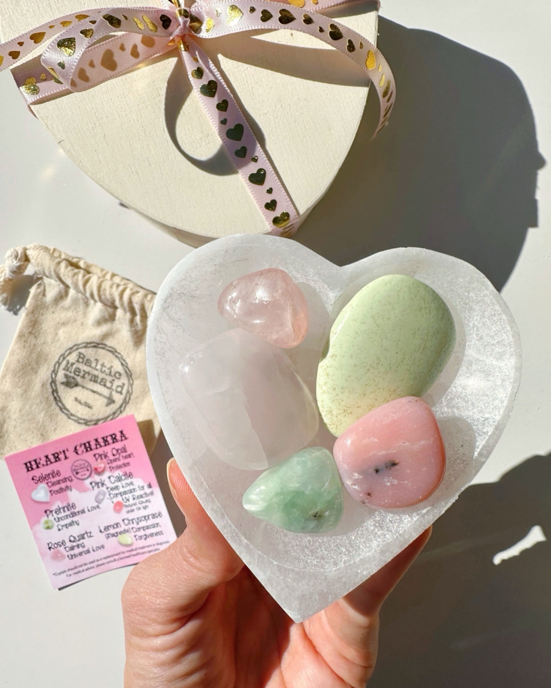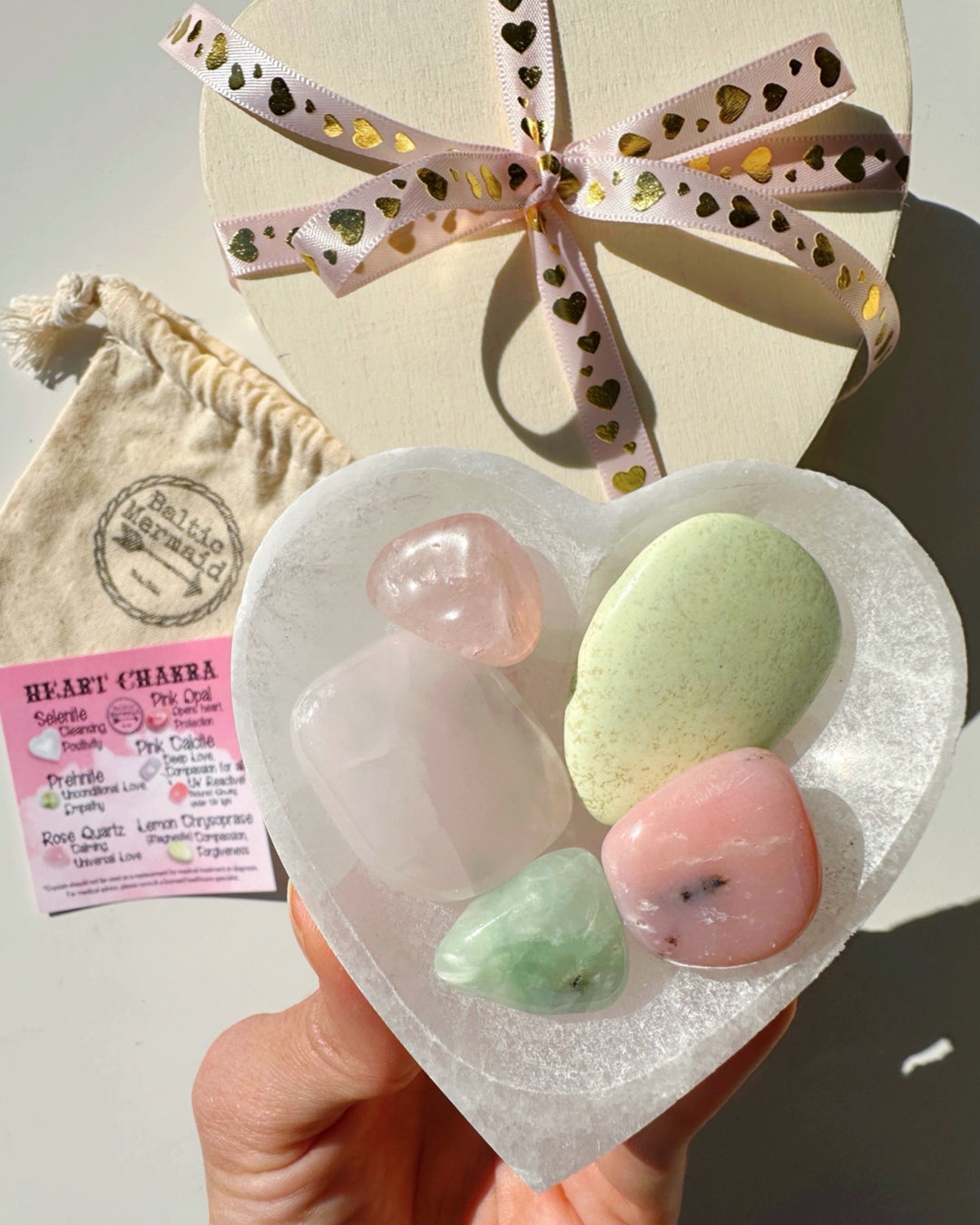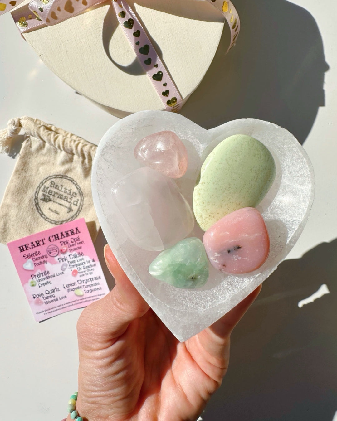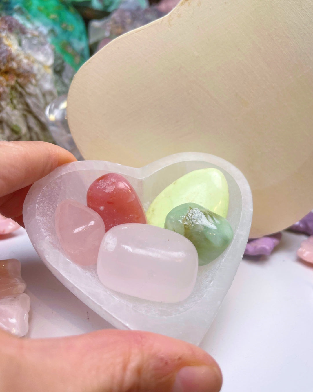 This Valentine Set is so pretty! A little Selenite Heart Shaped Dish and 5 heart chakra tumbled stones in a cloth pouch. All 6 pieces come in a 5” heart shaped bentwood poplar box that is great for keeping all kinds of treasures in.
