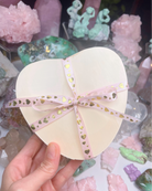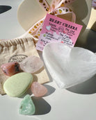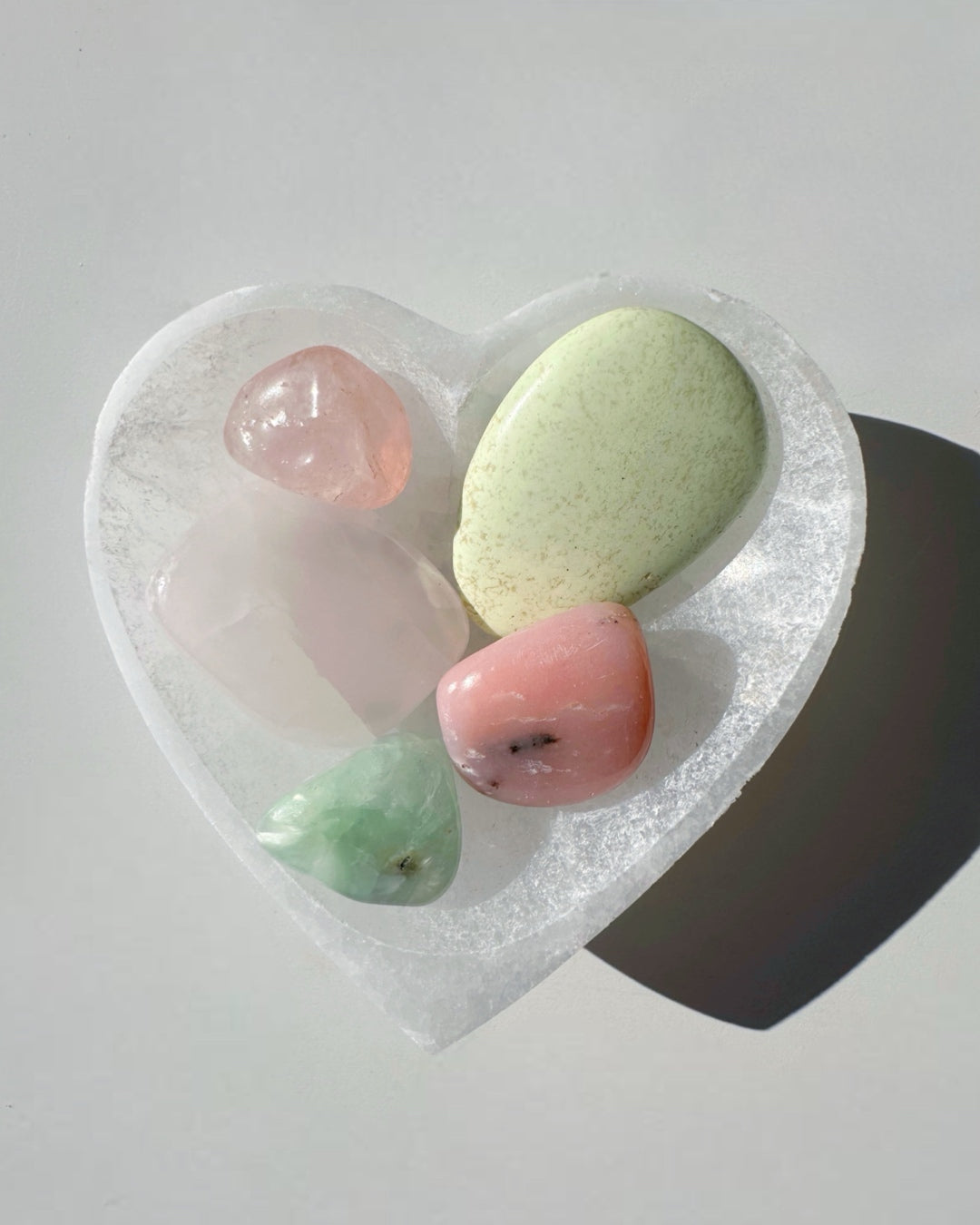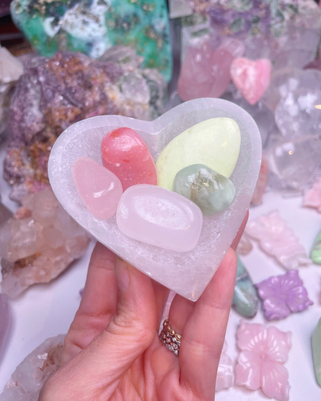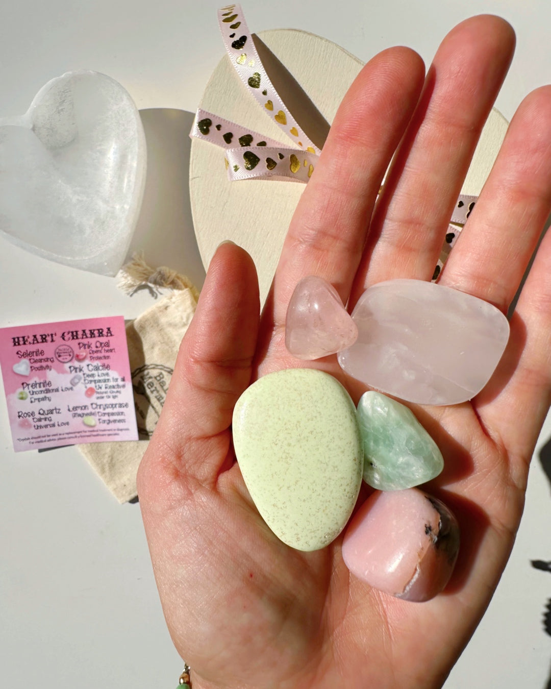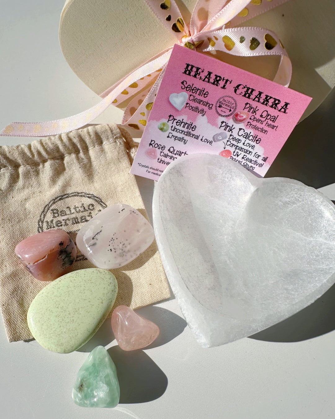 This Valentine Set is so pretty! A little Selenite Heart Shaped Dish and 5 heart chakra tumbled stones in a cloth pouch. All 6 pieces come in a 5” heart shaped bentwood poplar box that is great for keeping all kinds of treasures in.