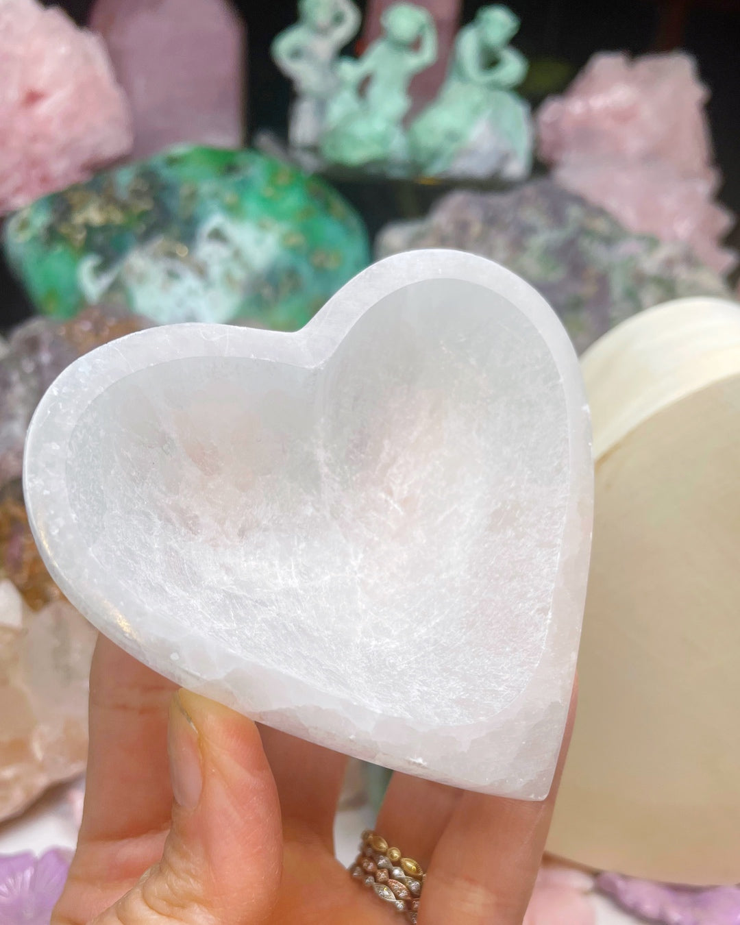 Selenite Heart dish measures approximately 3.25” x 3.55” x 1.25” deep