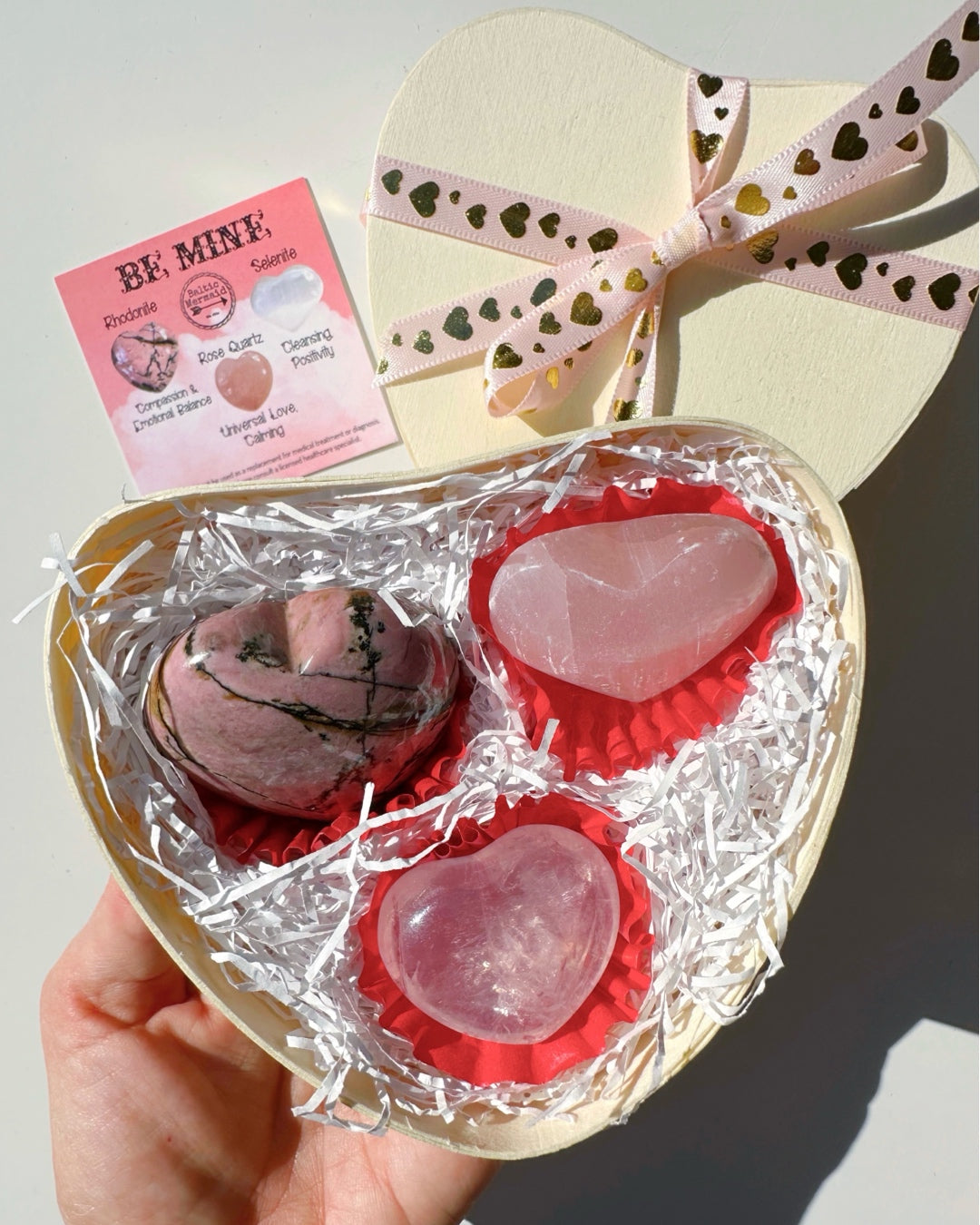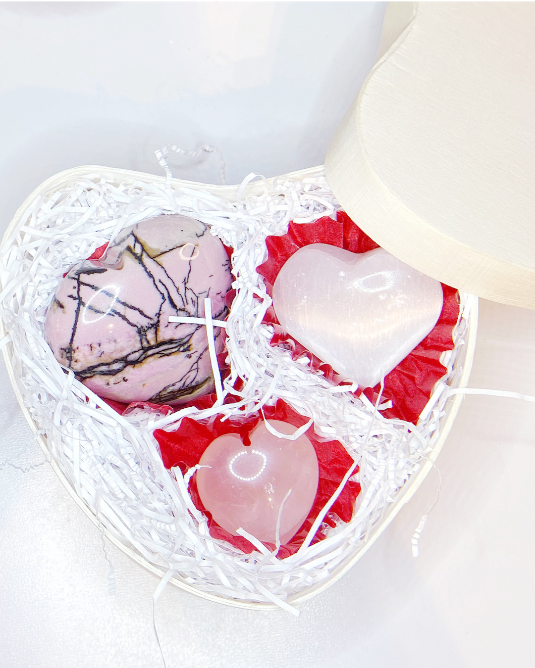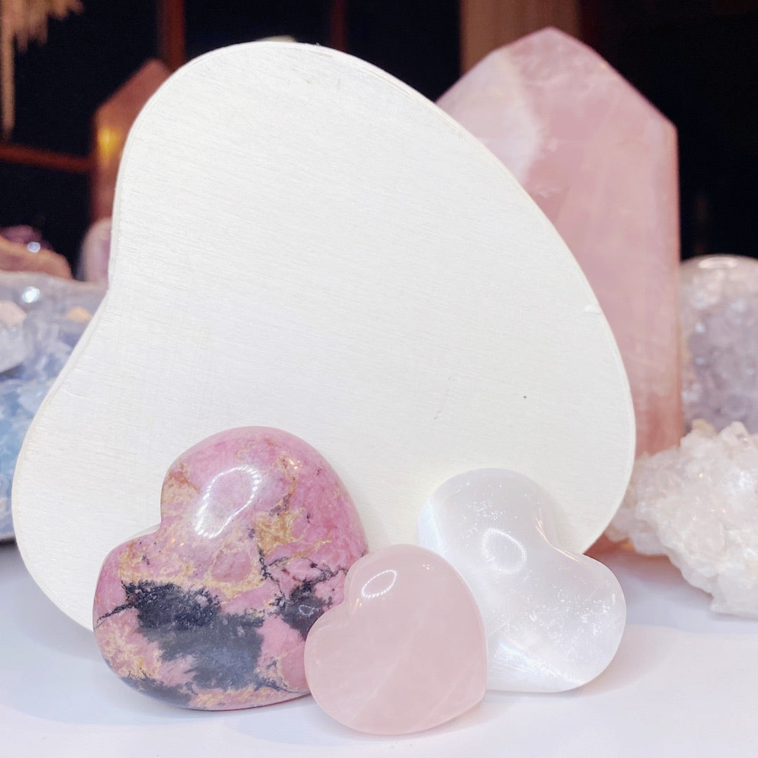 The All The Hearts Valentine Crystal Set includes a a Little Rose Quartz Heart, Selenite Heart and a beautiful Rhodonite Heart. All three come in a 4” heart shaped poplar bentwood box that is great for keeping all kinds of treasures in.
