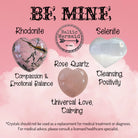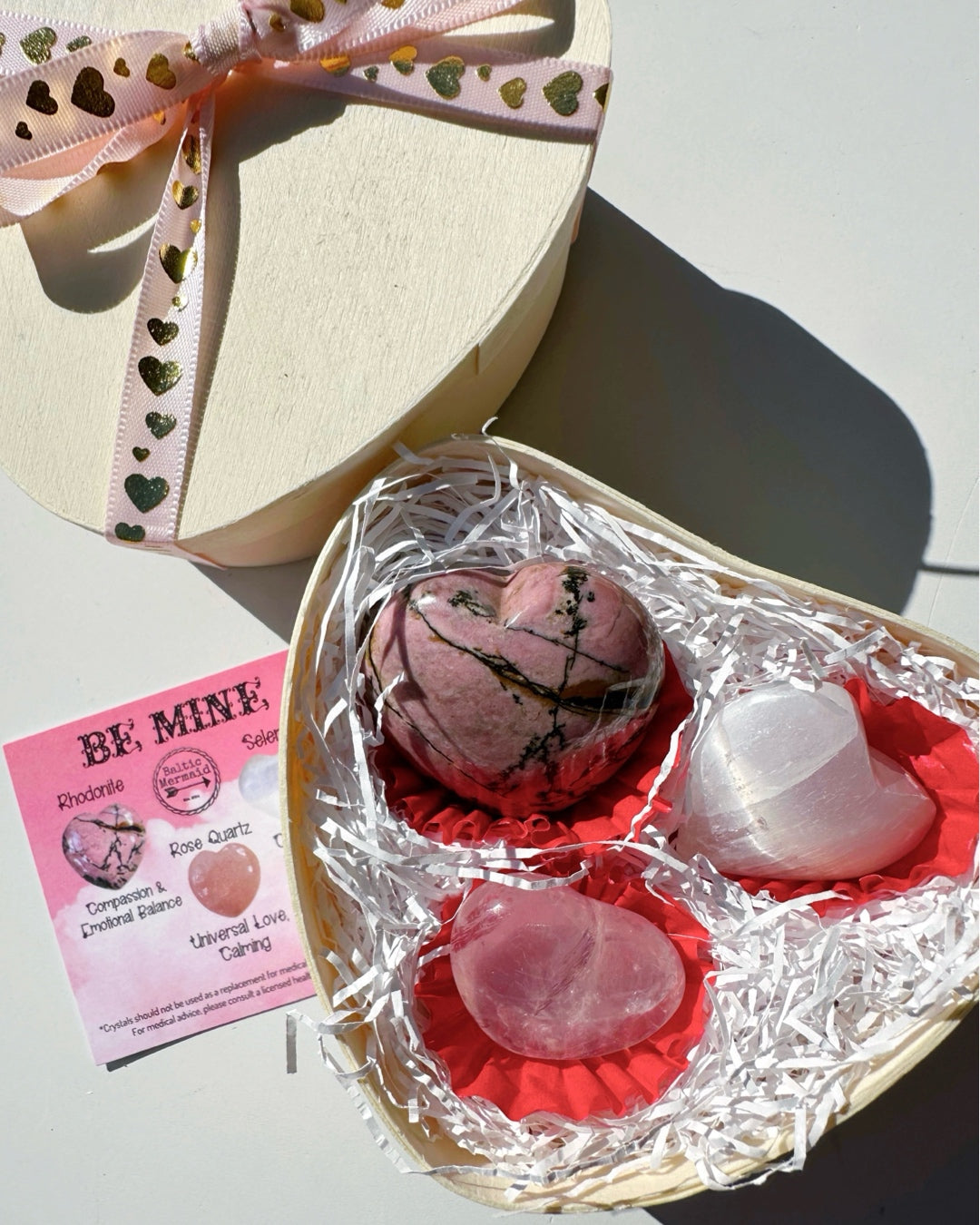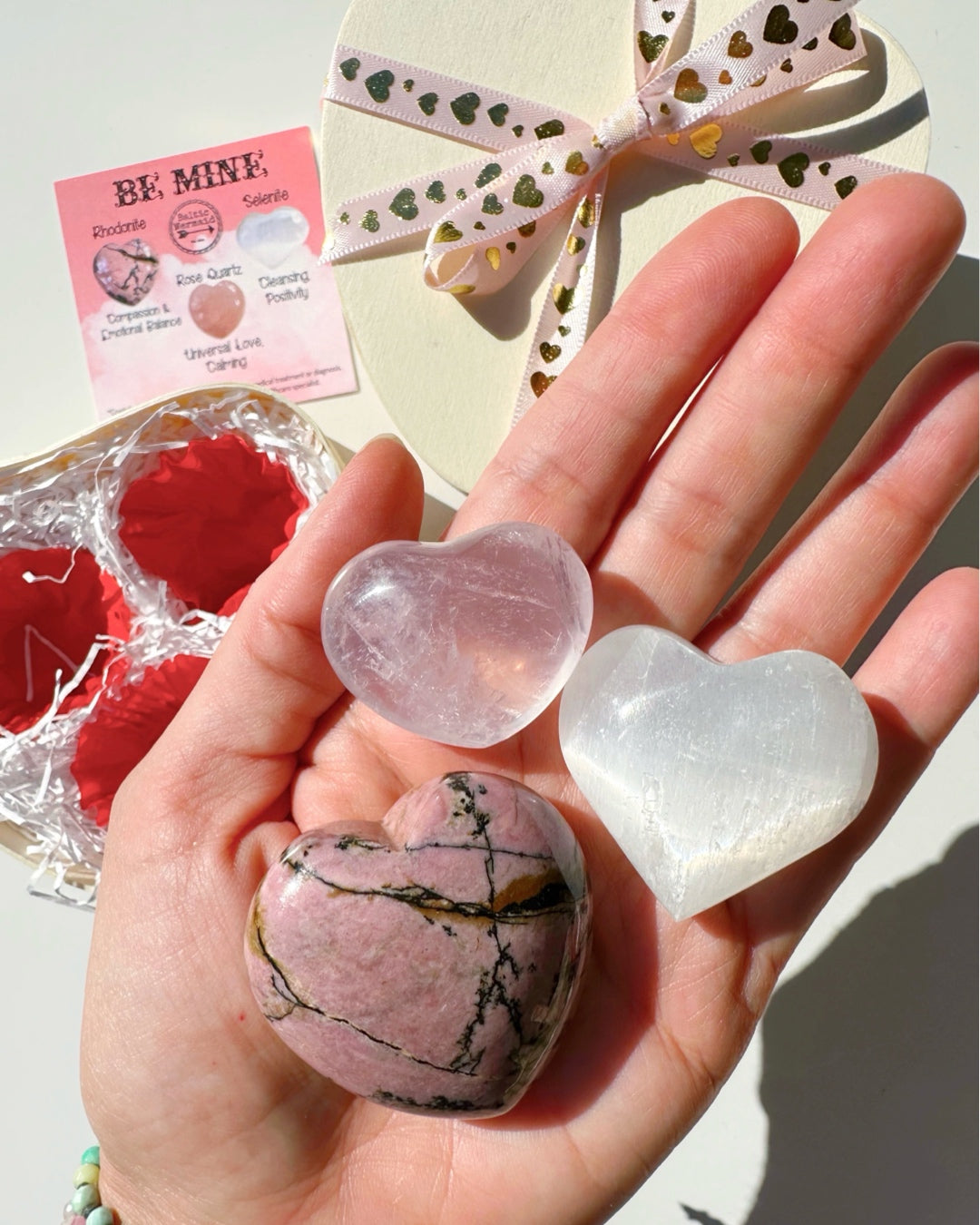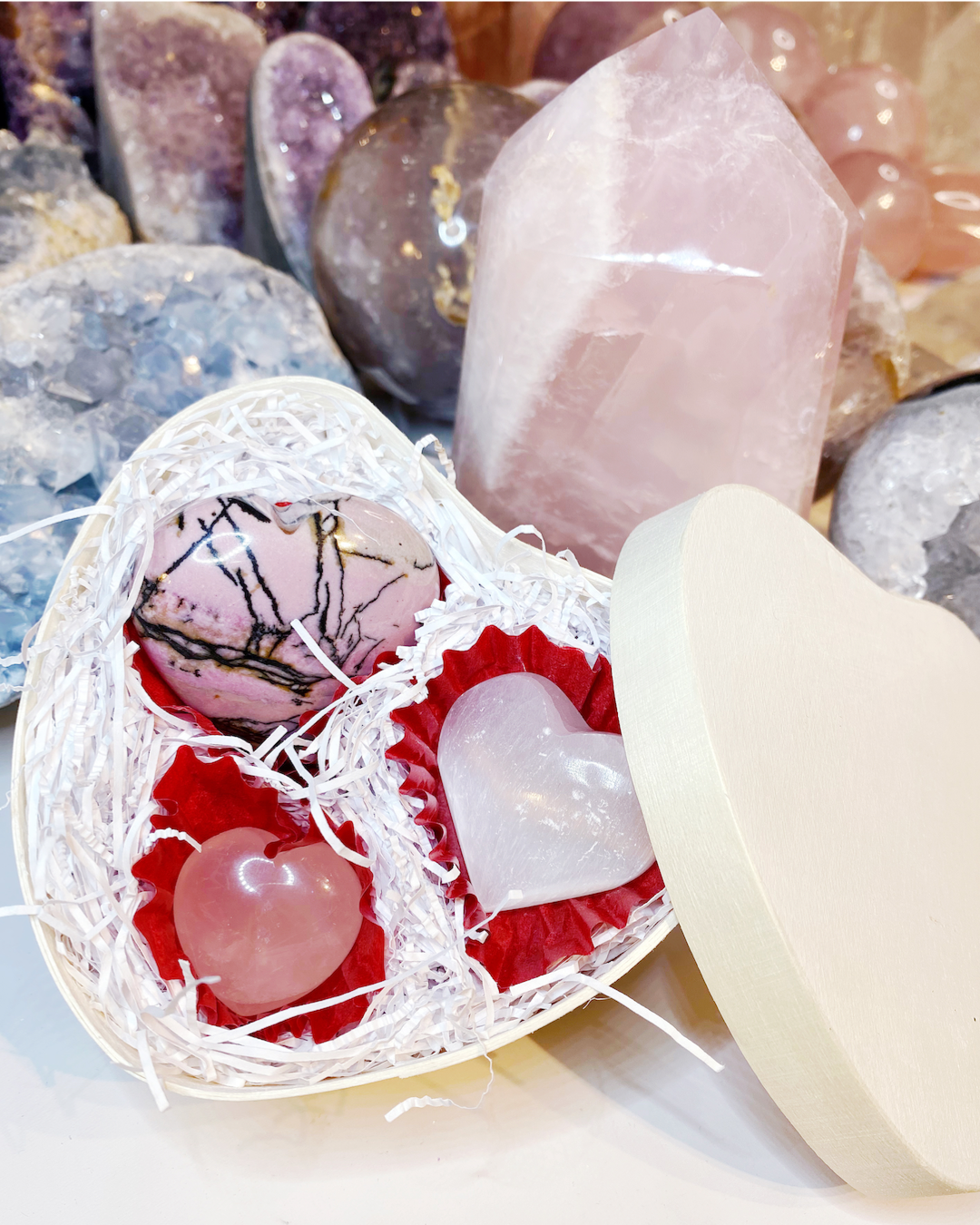 The All The Hearts Valentine Crystal Set includes a a Little Rose Quartz Heart, Selenite Heart and a beautiful Rhodonite Heart. All three come in a 4” heart shaped poplar bentwood box that is great for keeping all kinds of treasures in.