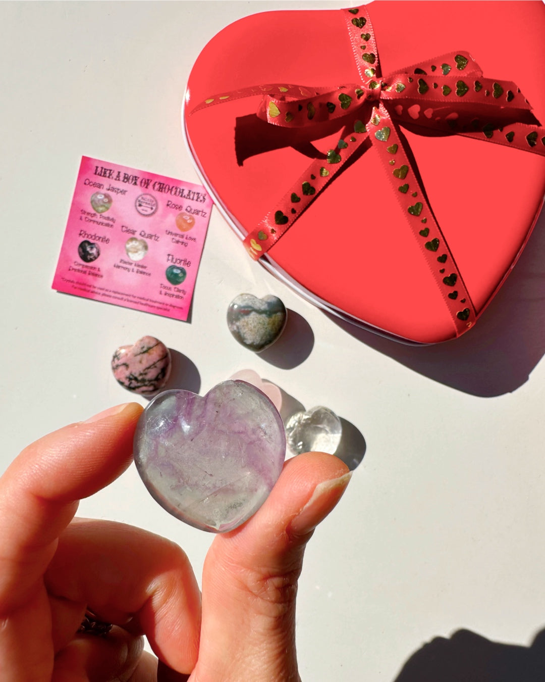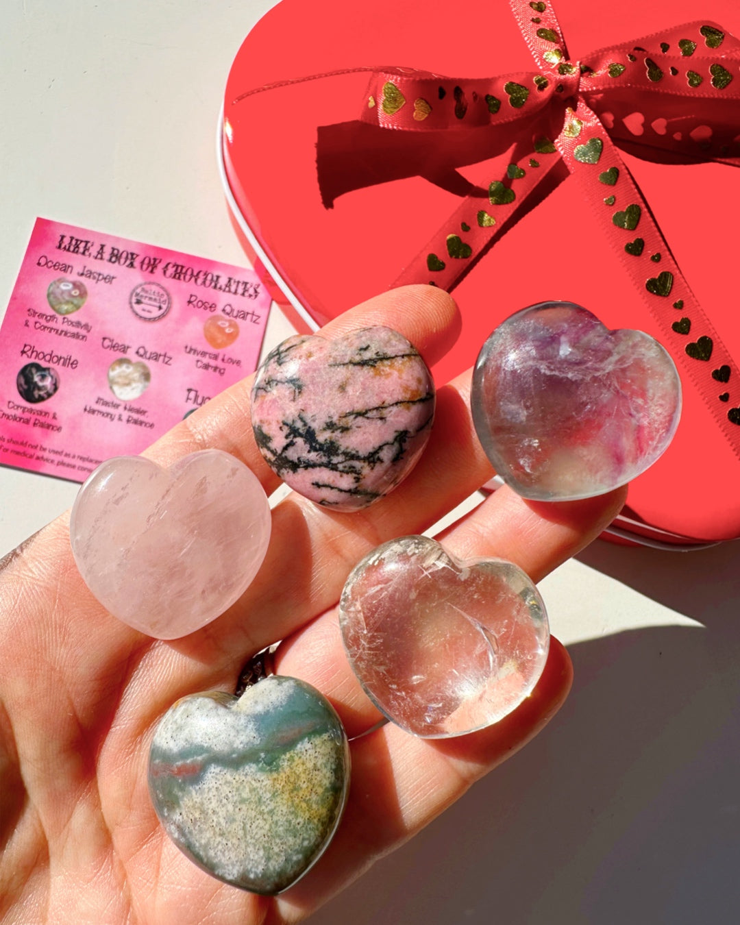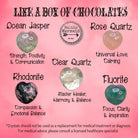 The “Like a Box of Chocolate” Valentine Crystal Set includes 5 beautiful carved hearts, 4 connected to the Heart Chakra; Rose Quartz, Rhodonite, Ocean Jasper and Fluorite. The fifth heart is Clear Quartz a master heater and helps to amplify the other crystals.