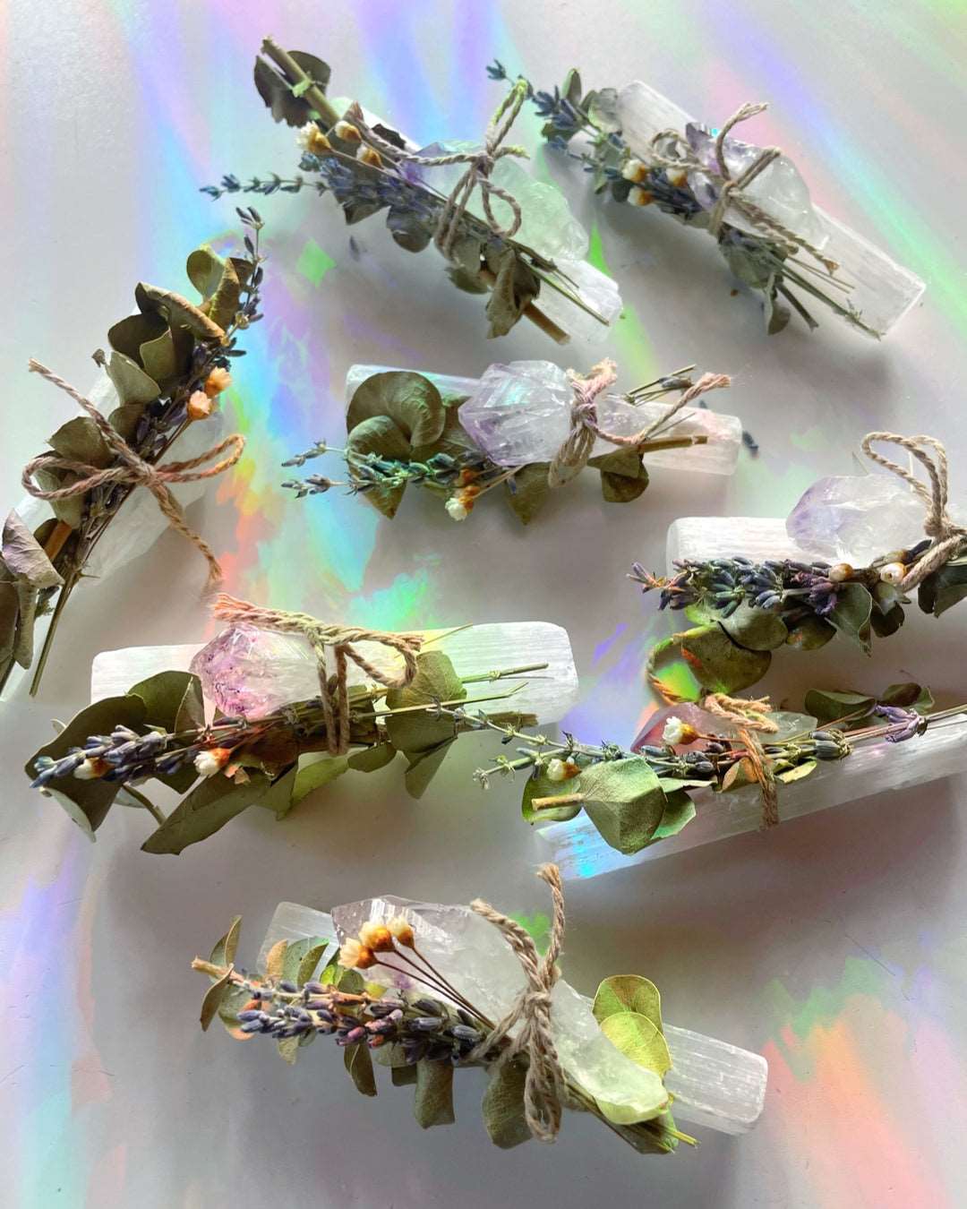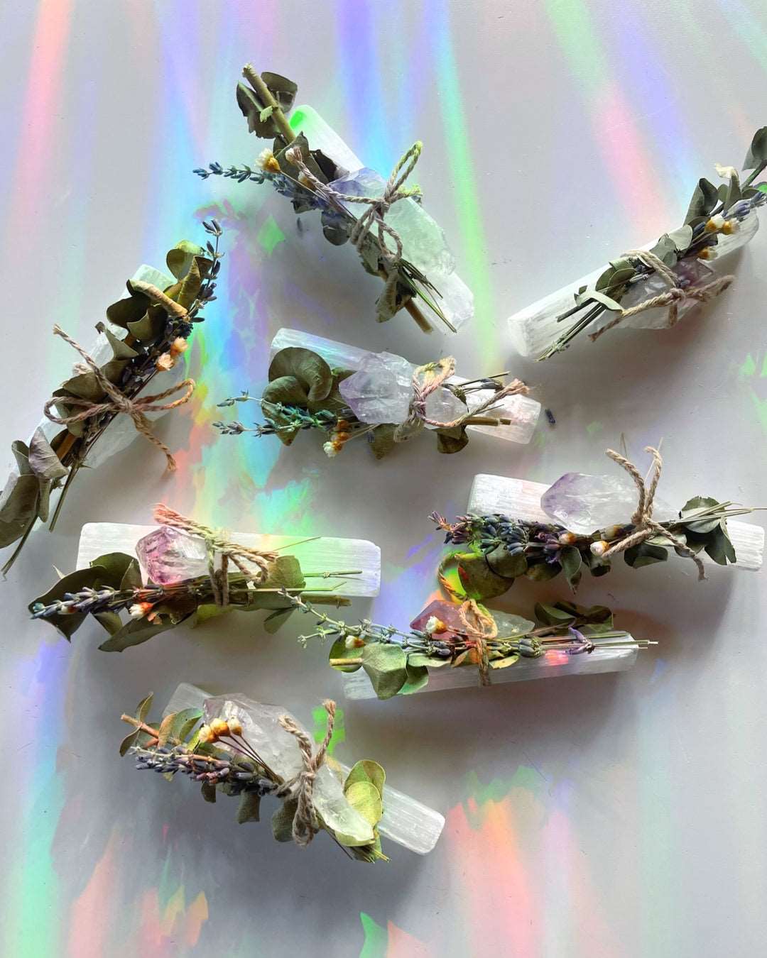 This Amethyst & Selenite Bundle is the perfect tool to cleanse and protect. The selenite from Morocco brings a powerful cleansing energy to any space, while the amethyst from Brazil is known for its ability to clear away any negative energy. Complete with dried flowers; eucalyptus, lavender, and Brazilian star daisy. This bundle brings a unique combination of healing properties and protection.