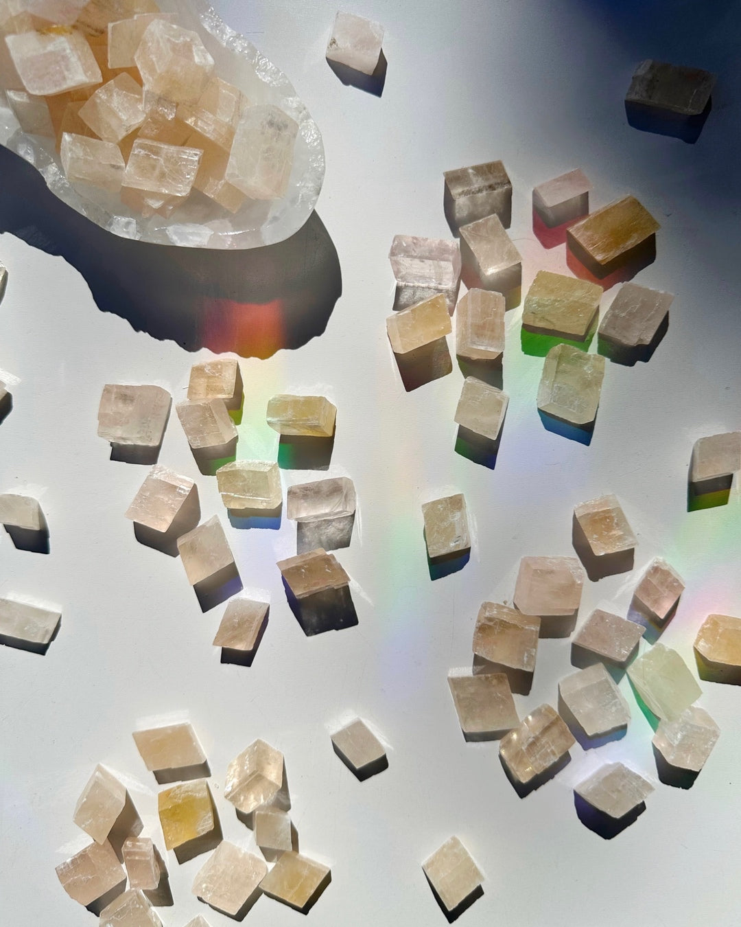 Optical calcite, also known as Iceland Spar, offers clarity, perspective, focus and inspiration. These crystal, geometric crystals naturally form in perfect rhomboid shapes and are filled with with beautiful rainbows. Pink Optic Calcite offers a gentle loving perspective. These are from Mexico and are UV reactive and will glow bright pink under a UV light