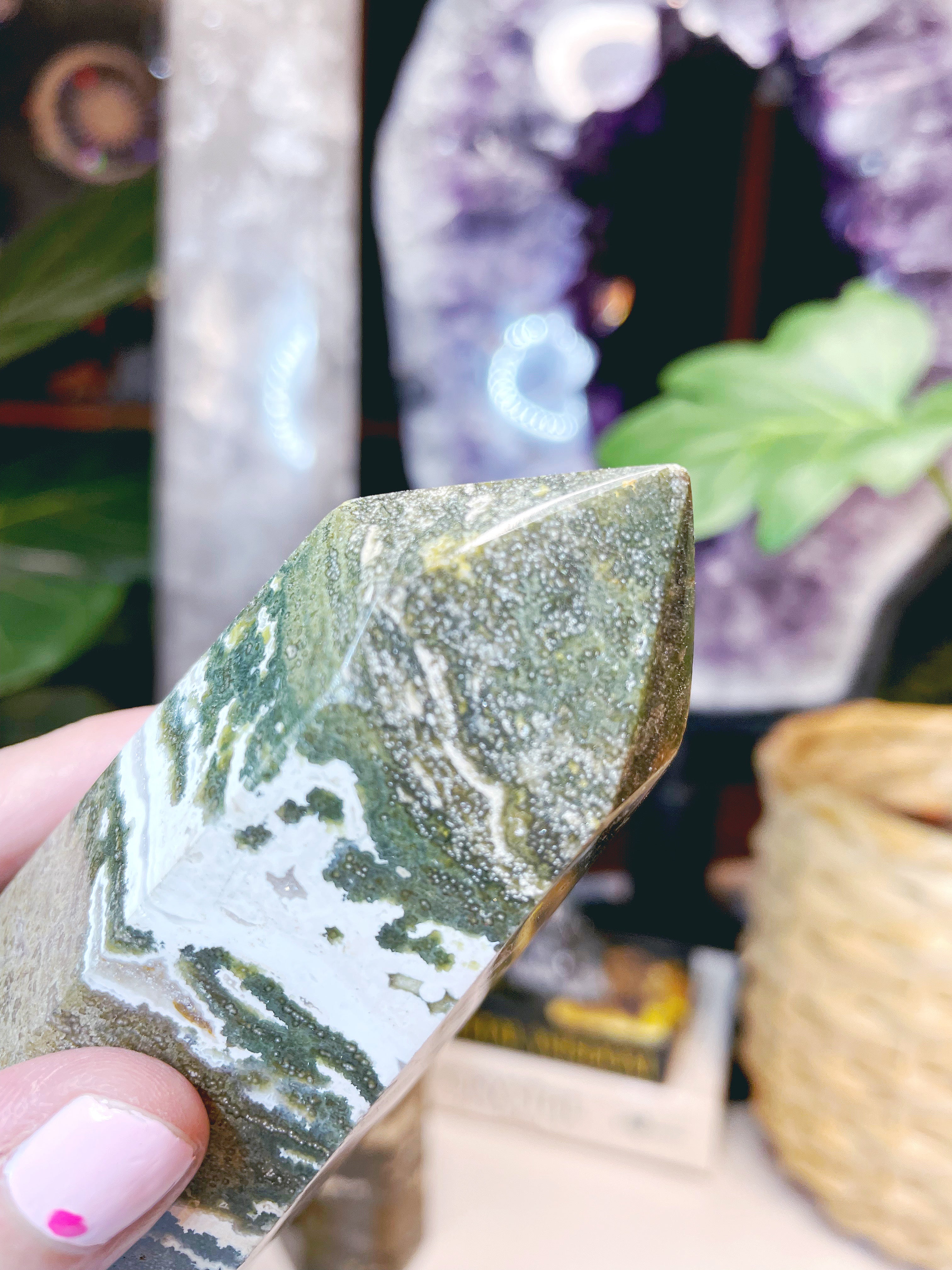 Ocean Jasper, also known as Orbicular Jasper is a stone of positivity, very helpful for those suffering from depression to focus on the positive and wholesome aspects of life. Ocean Jasper helps to work through self destructive and addictive behaviors, (Great paired with amethyst for this). Keeps the atmosphere of a room pleasant and relaxing.