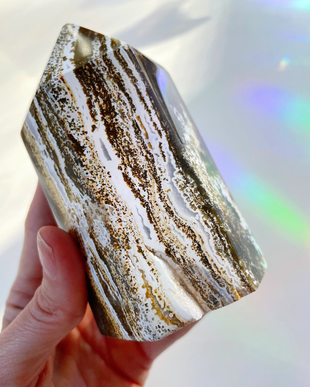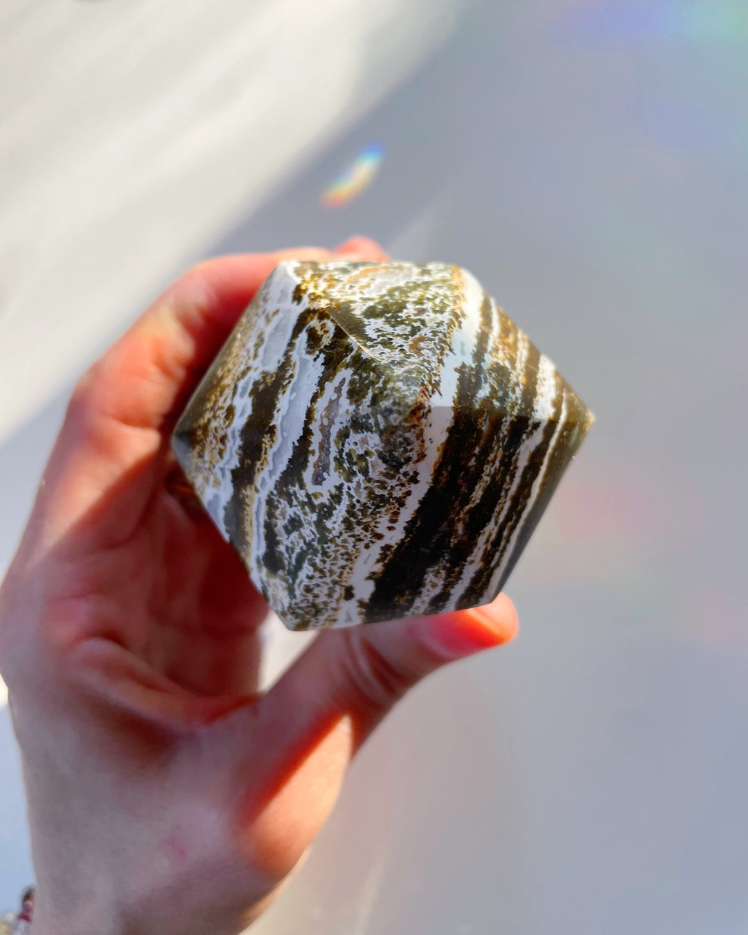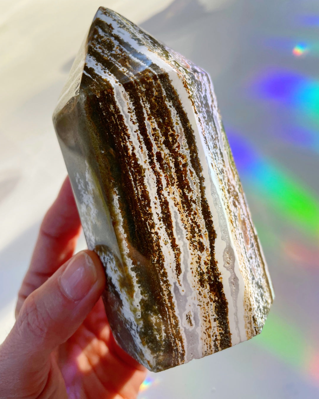 Ocean Jasper, also known as Orbicular Jasper is a stone of positivity, very helpful for those suffering from depression to focus on the positive and wholesome aspects of life. Ocean Jasper helps to work through self destructive and addictive behaviors, (Great paired with amethyst for this). Keeps the atmosphere of a room pleasant and relaxing.