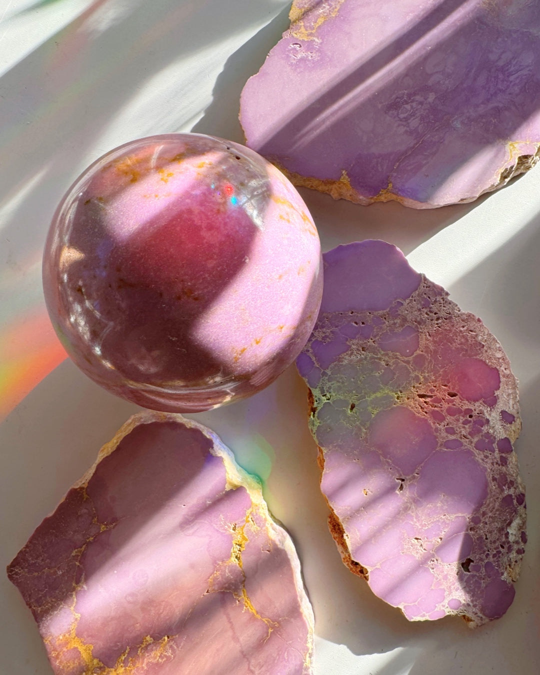 This impressive Phosphosiderite sphere showcases a rich blend of lavender and violet tones, beautifully accented by veins of golden inclusions that run throughout. A striking piece from Peru, this large super quality sphere emanates calming and serene energy, making it an ideal centerpiece for any space dedicated to relaxation or meditation.