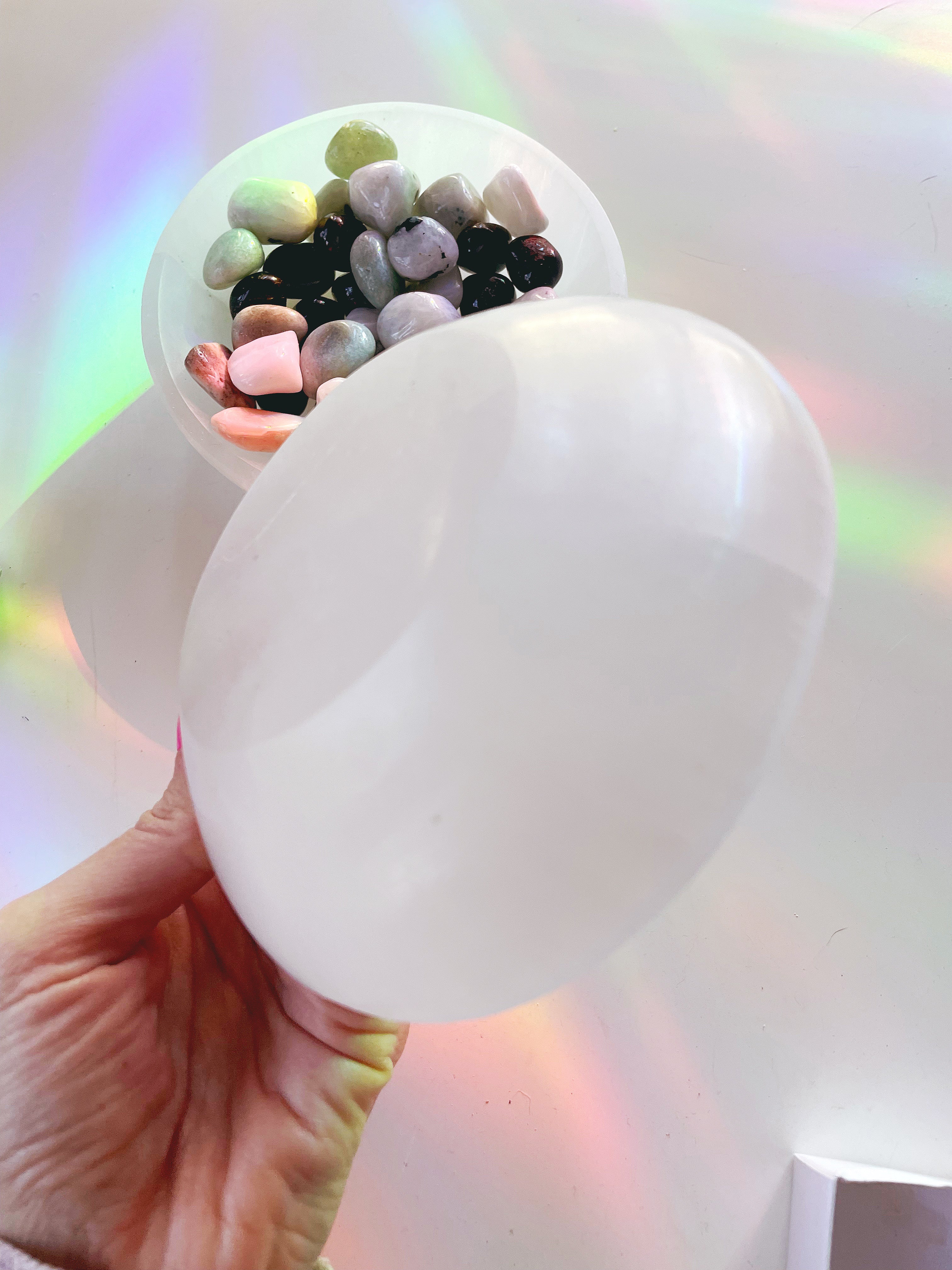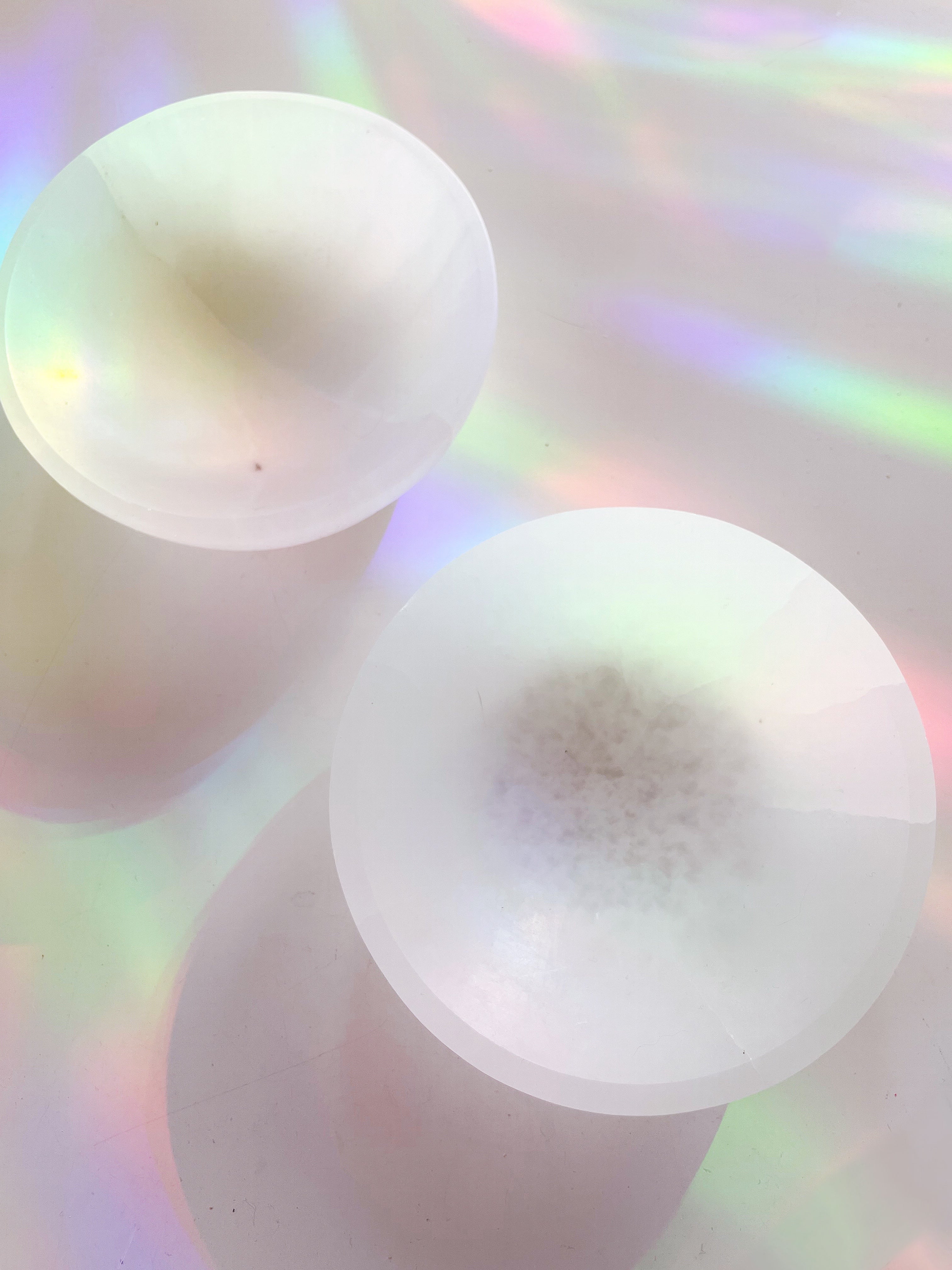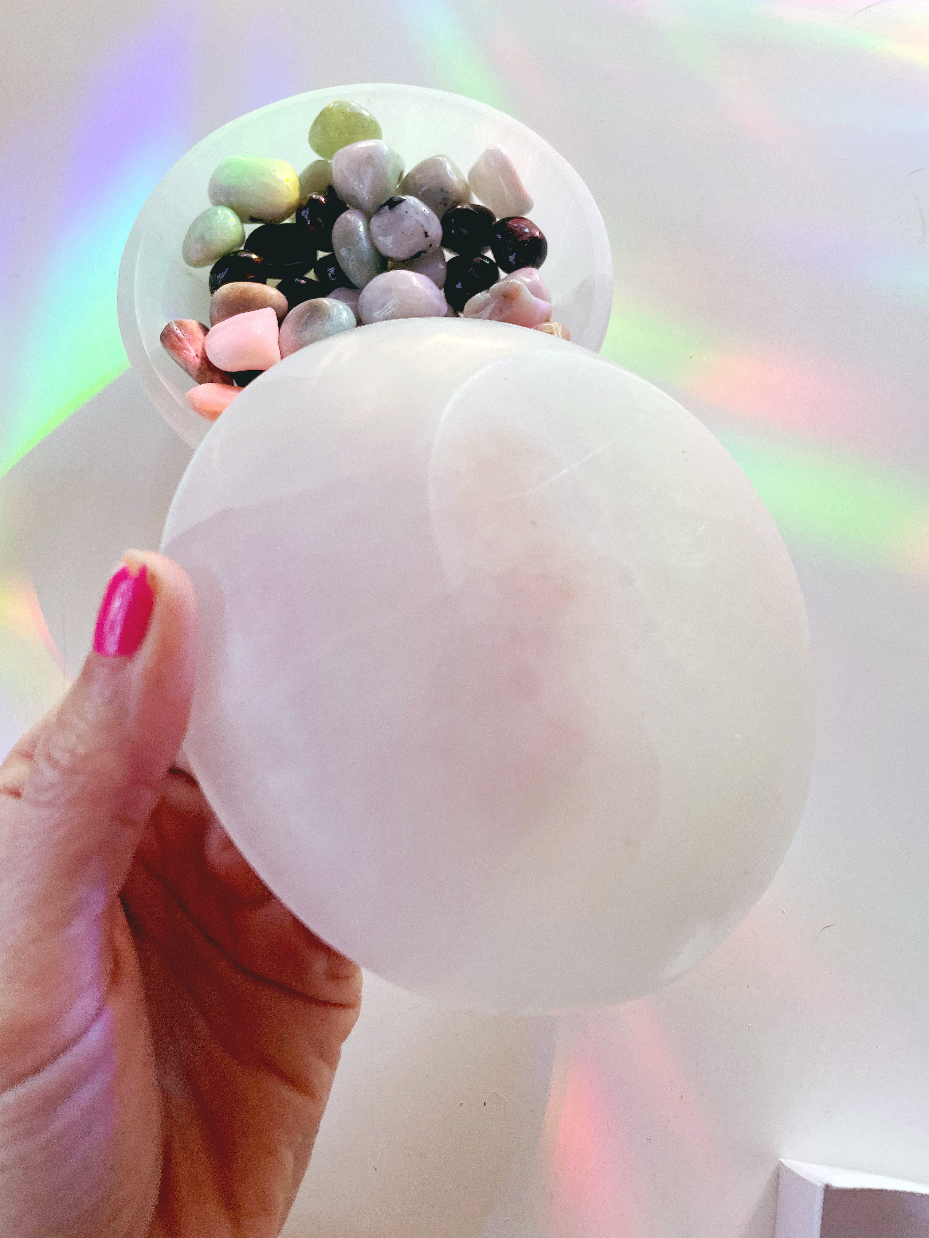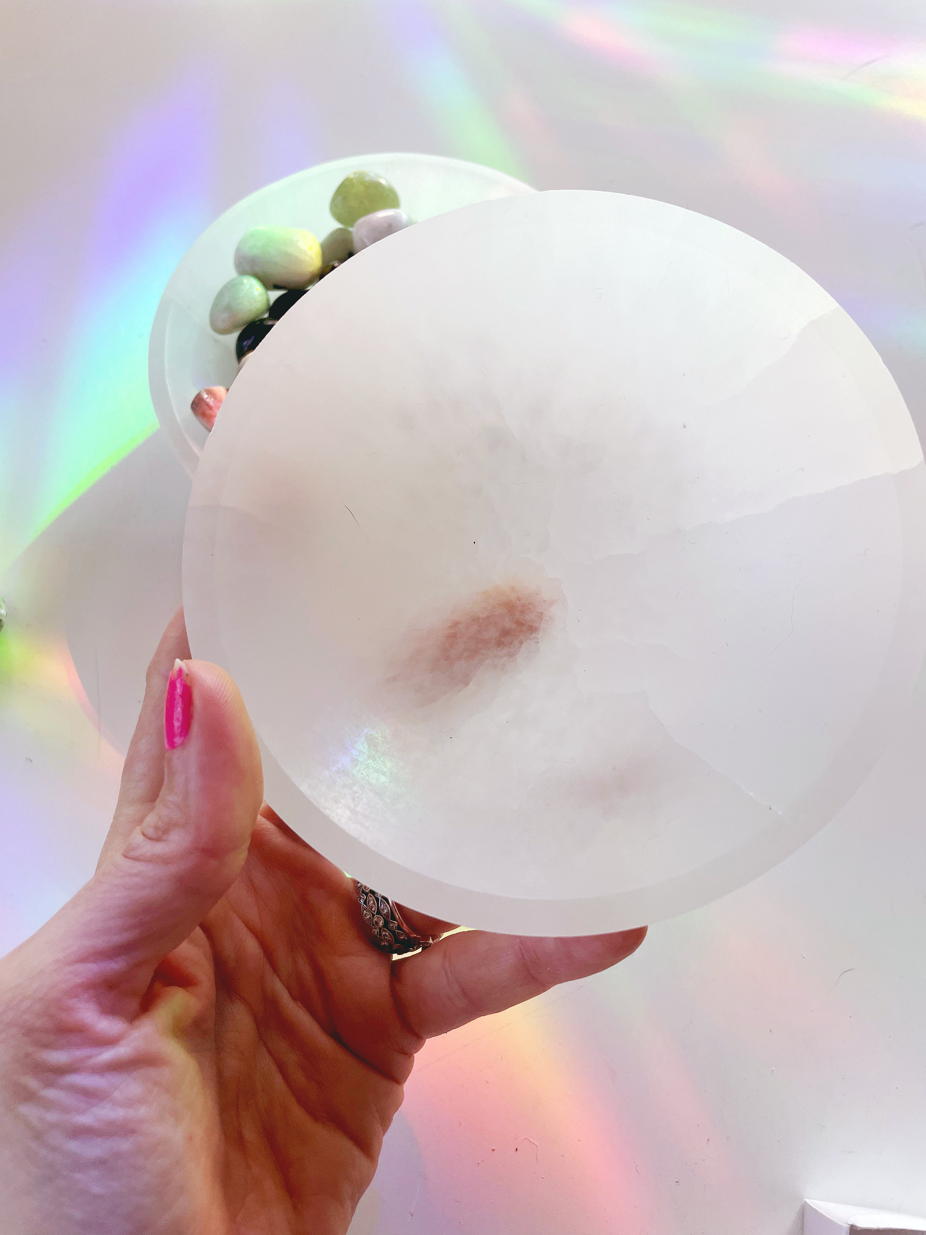 Selenite bowls are perfect for holding and cleansing tumbles stones or anything else you put inside. Price is for one selenite dish intuitively picked for you.