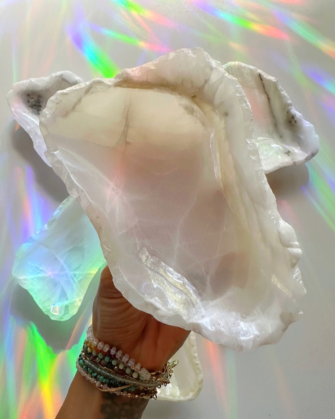 Beautiful White Calcite dish from Mexico. The stunning, glossy finish adds a subtle elegance to any setting. Perfect for the kitchen, desk, shelf, or coffee table.