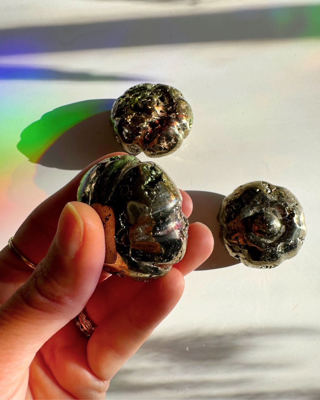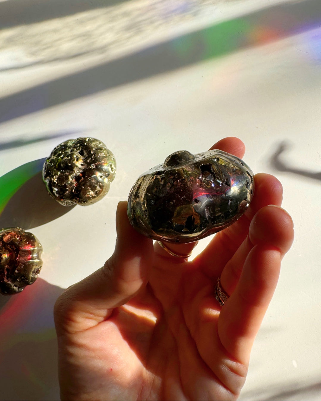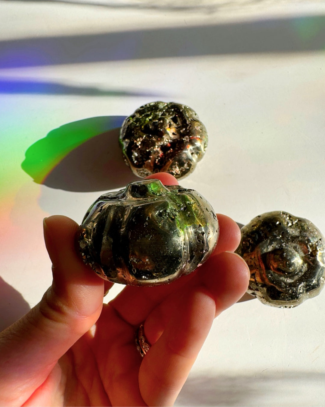 Whether you’re sprucing up your Halloween decorations or just love a little sparkle, pyrite pumpkins are a fun and powerful way to add some shine to your space. Grab yours while they last!