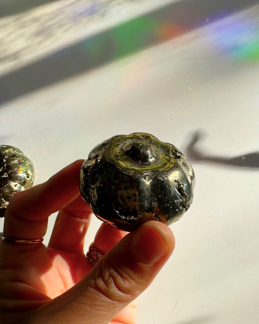 This hand-carved Pyrite Pumpkin from Peru is the perfect mix of spooky and sparkly! Pyrite, with its natural metallic shine, adds a fun, unique twist to the classic pumpkin shape. This little pumpkin shimmers in the light, making it a great centerpiece or addition to your autumn décor.