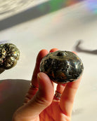 This hand-carved Pyrite Pumpkin from Peru is the perfect mix of spooky and sparkly! Pyrite, with its natural metallic shine, adds a fun, unique twist to the classic pumpkin shape. This little pumpkin shimmers in the light, making it a great centerpiece or addition to your autumn décor.