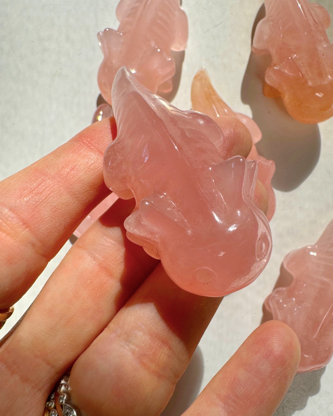Carved Rose Quartz Axolotl’s are sone of the cutest figures I’ve gotten! They are self standing and a beautiful pink color.
